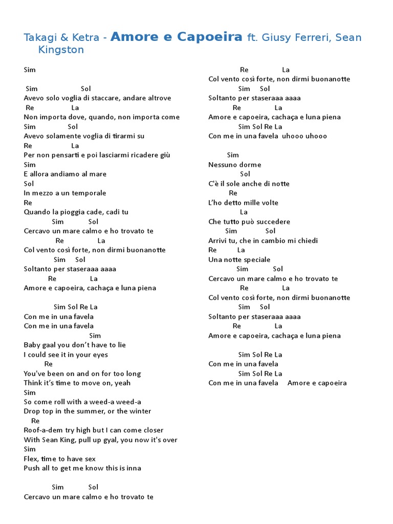 Takagi & ketra, giusy ferreri, sean kingston — amore e capoeira 02:52. Amore e capoeira è un singolo del duo musicale italiano takagi & ketra pubblicato il 1º giugno 2018. Sim sol nessuno dorme, c'è il sole anche di notte. Il singolo ha visto la partecipazione alla parte vocale della cantante italiana giusy ferreri e del cantante giamaicano sean kingston. Aleh — capoeira mata um 05:30.